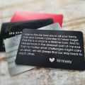 3.5" x 2.125" Aluminum Wallet Card in black. The font used in the sample pictured is Verdana.