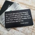 Tell your loved one exactly how you feel about them with this extra special wallet card. Carrying your romantic message chosen specially for them in their wallet will be a constant reminder of your everlasting love. Give this wallet card for Valentine's day, birthdays, anniversaries, or just because you want to show your feelings.